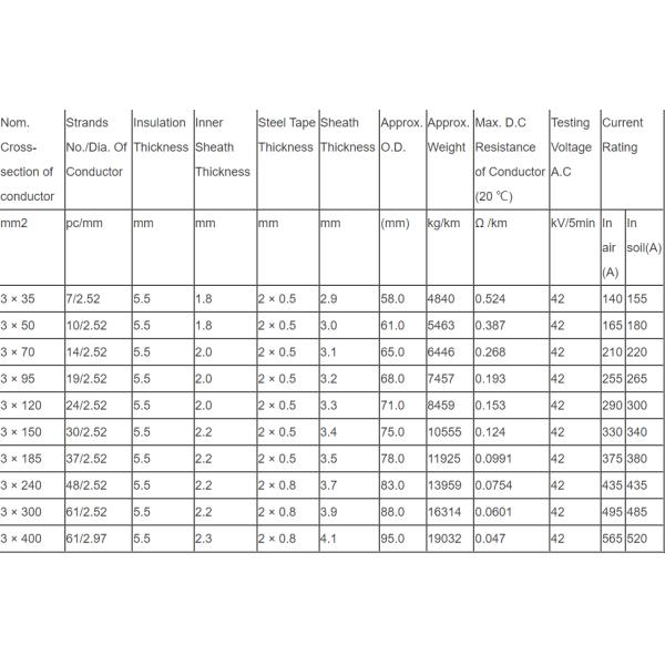 | Normal cross sectional area(mm²) | Appro conductor dia(mm) | Nom insulation thickness(mm) | Copper tape thickness(mm) | Copper wire screen area(mm²) | Appro. Insulation dia(mm) | Nom sheath thickness(mm) | Appro overall diameter(mm) | Appro weight(kg/km) | |